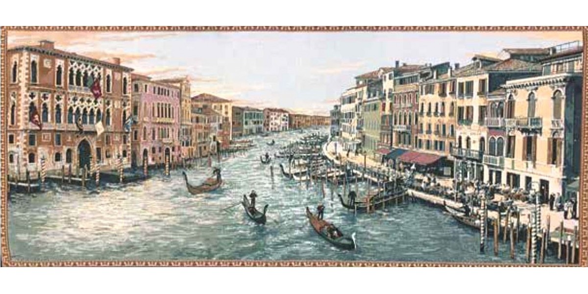 Motiv představuje živou scenérii Velkého kanálu, lemovaného historickými paláci, kavárnami a elegantními gondolami, které se staly symbolem města. Gobelín přenáší tuto malířskou poetiku do textilní podoby a díky jacquardové technice získává hloubku, strukturu a jemné detaily, které působí mimořádně autenticky.