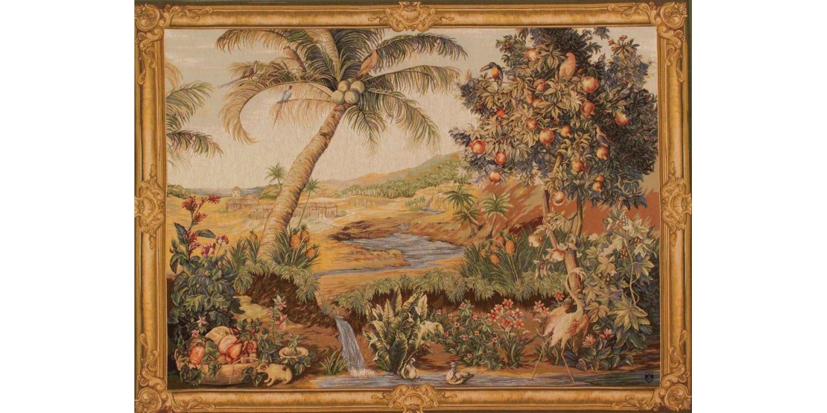 Motiv L’Oasis přináší do interiéru exotiku, teplo a atmosféru vzdálených krajů – přesně v duchu cestovatelských tapisérií, které byly v 18. století nesmírně oblíbené.