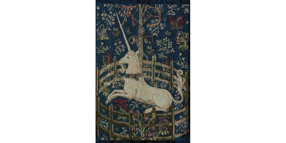 Tento jemný gobelín na hlubokém modrém pozadí přináší do interiéru fragment slavného cyklu „Chasse à la Licorne“ – jedné z nejikoničtějších středověkých tapiserií, dnes uchovávané v muzeu The Cloisters v New Yorku. Motiv zachycuje mýtickou jednorožku v okamžiku klidu a odevzdání, obklopenou symbolikou čistoty, vznešenosti a tichého tajemství.
